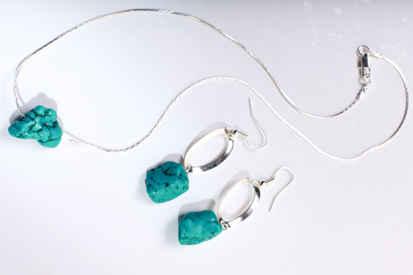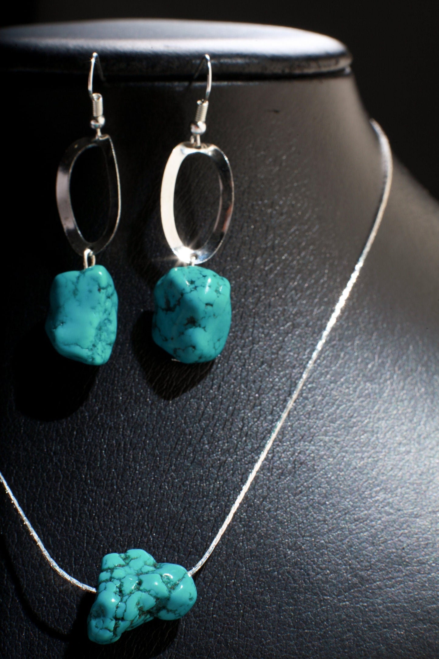 Natural Raw Turquoise Nugget Earring and Necklace Set in 16" Silver Filled Beading Chain and Ear wire Jewelry Set with 2" Extension Chain