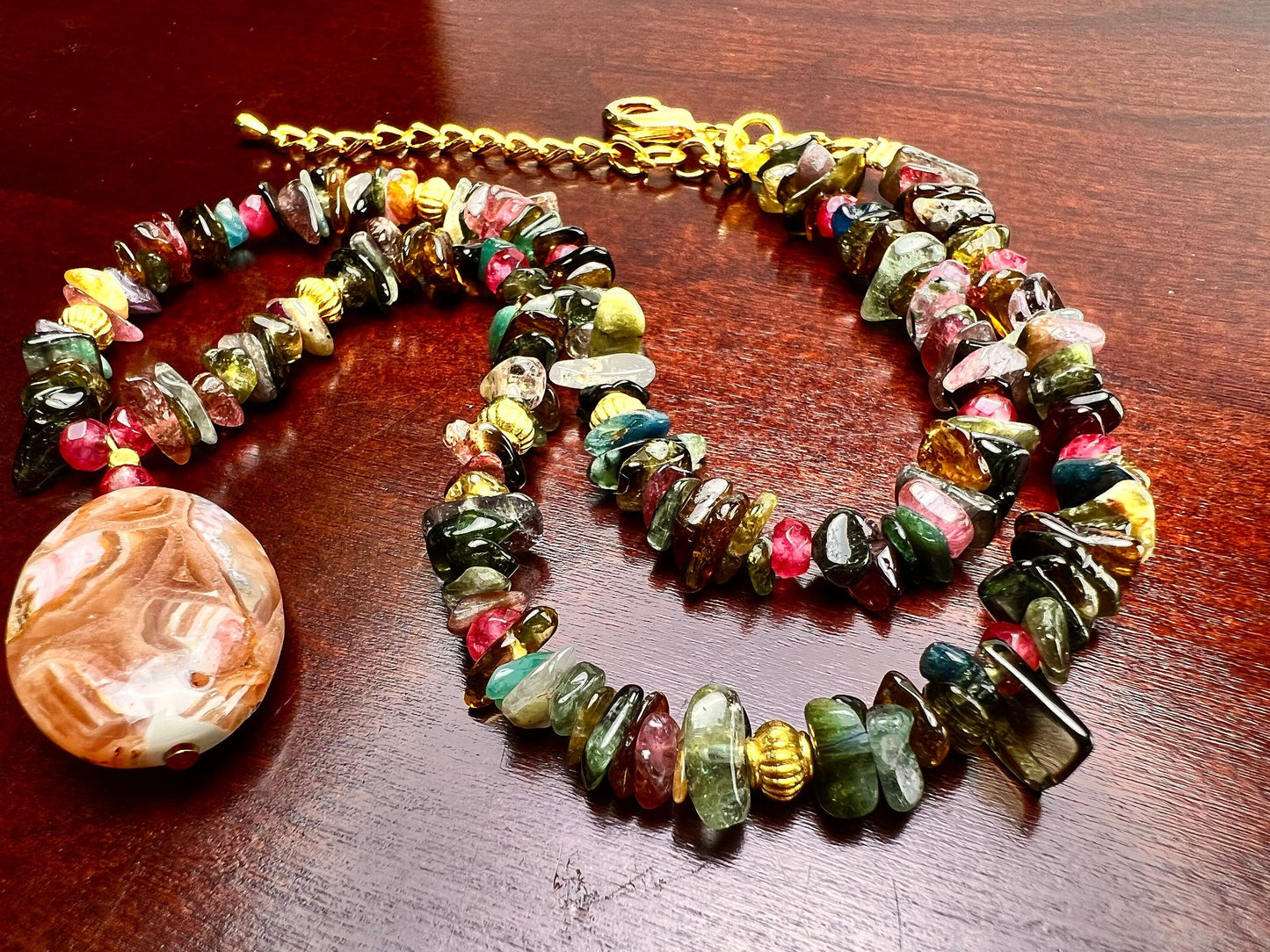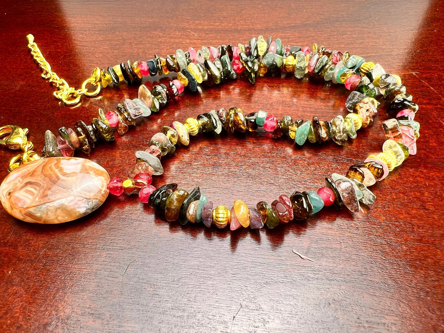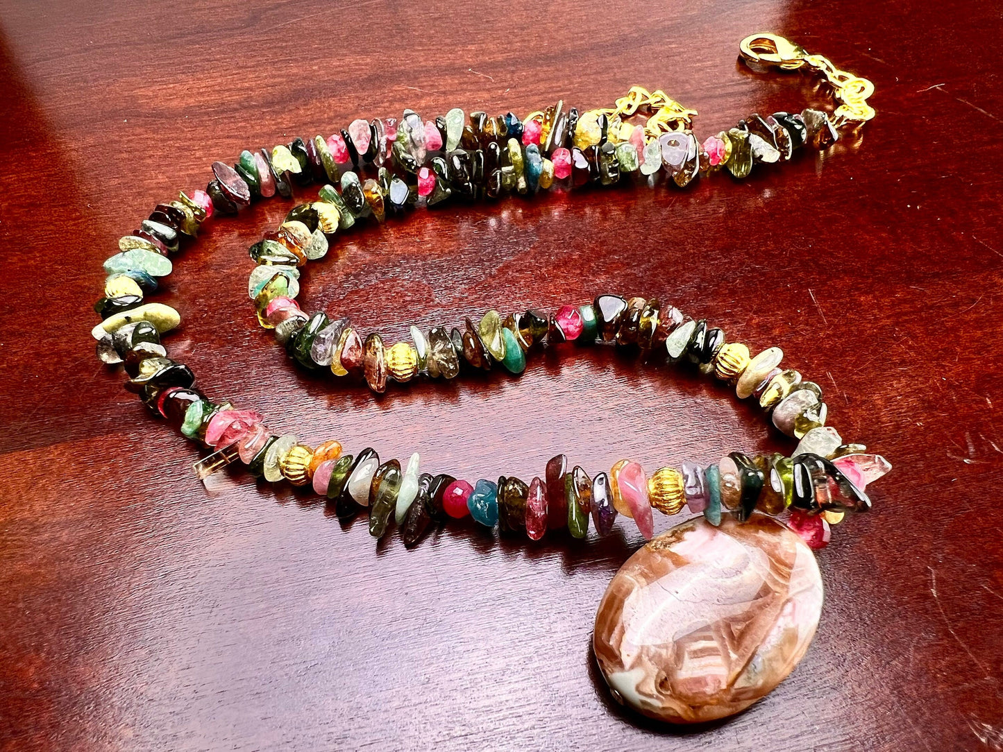 Natural Rhodochrosite 18x25mm Oval pendant, Multi Tourmaline raw nugget chips, Gold Necklace 16" with 2" Extension Chain healing energy gif
