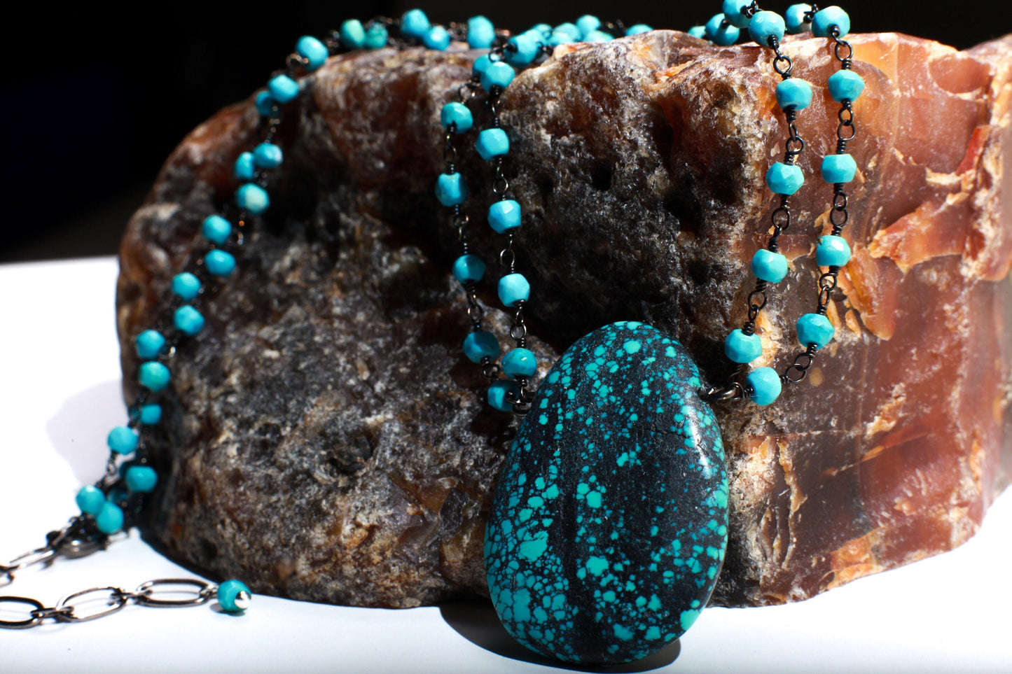 Natural Tibetan Spiderweb Turquoise Teardrop Pendant with Natural Turquoise Oxidized Silver Wire Wrap Double Layer 18+ 2" Extension Necklace