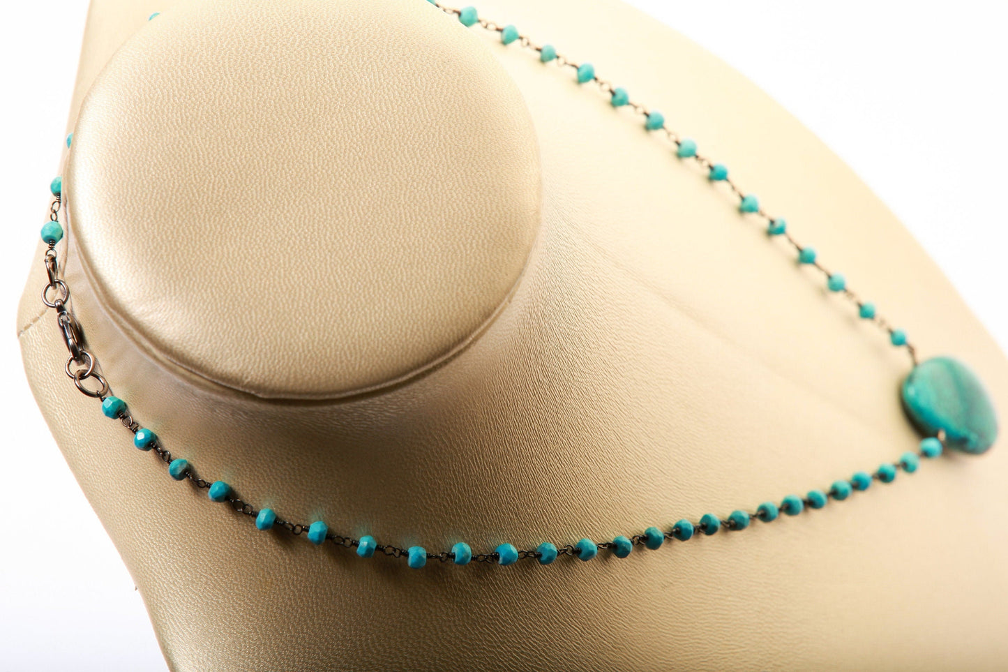 Natural Tibetan Turquoise Matrix Teardrop Pendant with Turquoise Beaded 18" Black Oxidized Necklace