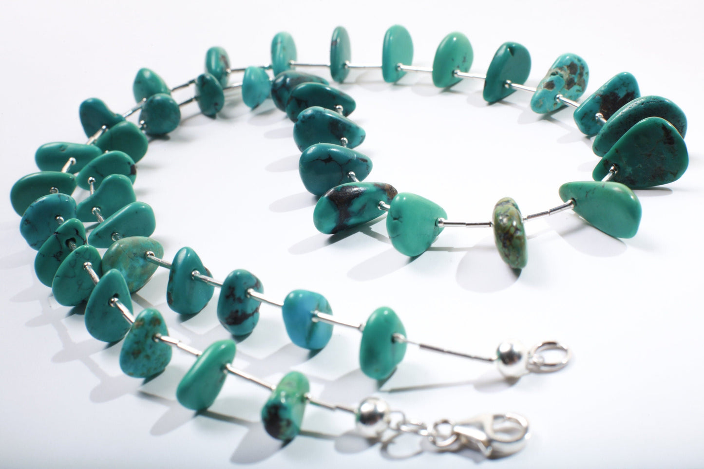 Natural Tibetan Turquoise Teardrop Necklace with 925 Sterling Silver Clasp and Liquid Silver 21" Navajo Fetish Necklace