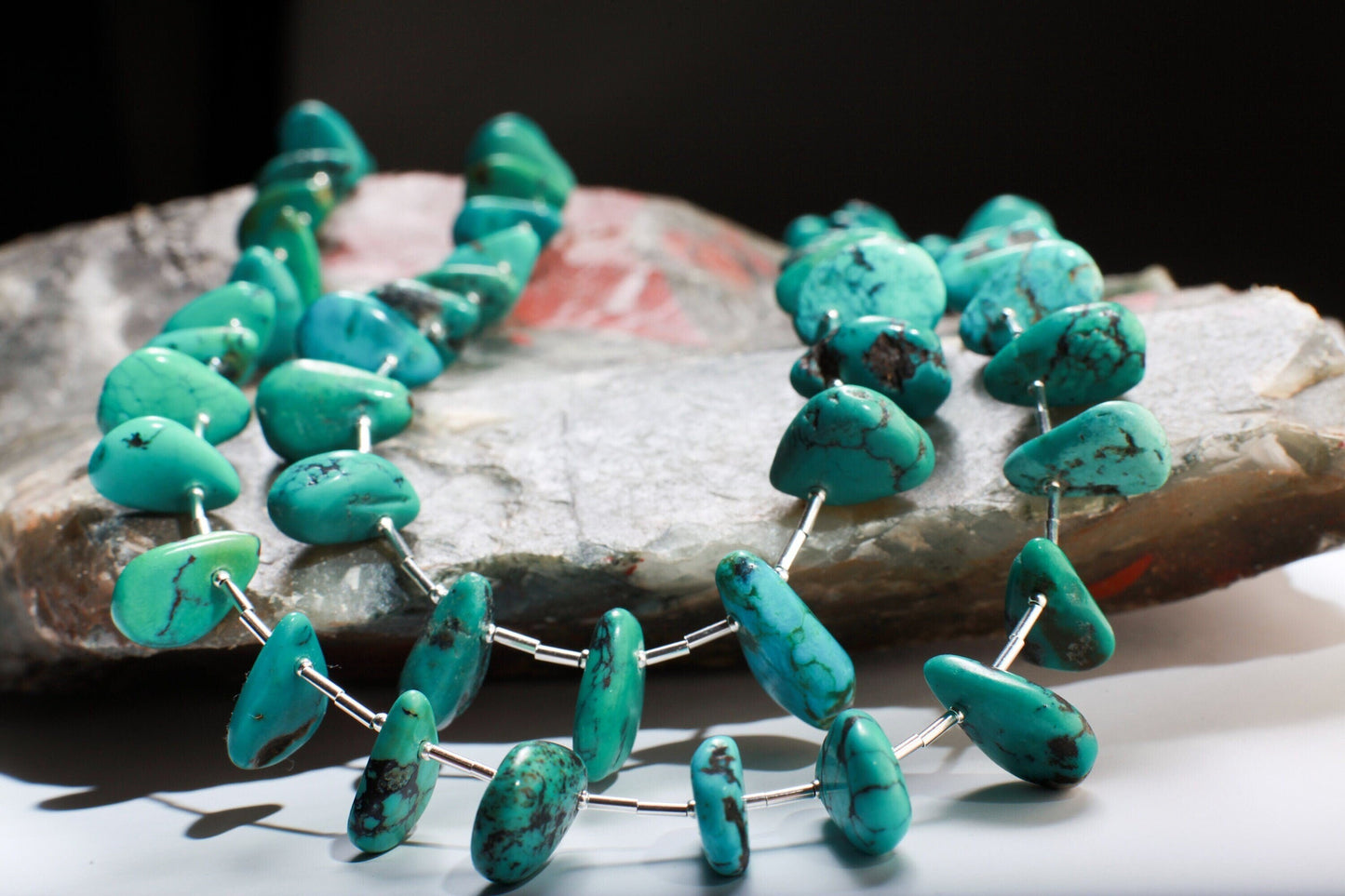 Natural Tibetan Turquoise Teardrop Necklace with 925 Sterling Silver Clasp and Liquid Silver 27" Double Layer Navajo Fetish Necklace