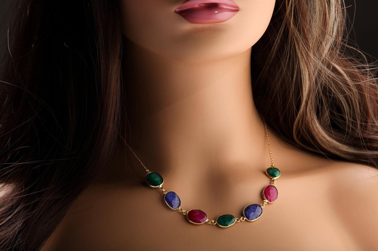 Materials: ruby, sapphire, emerald, gemstones, 14K Gold Filled Chain.