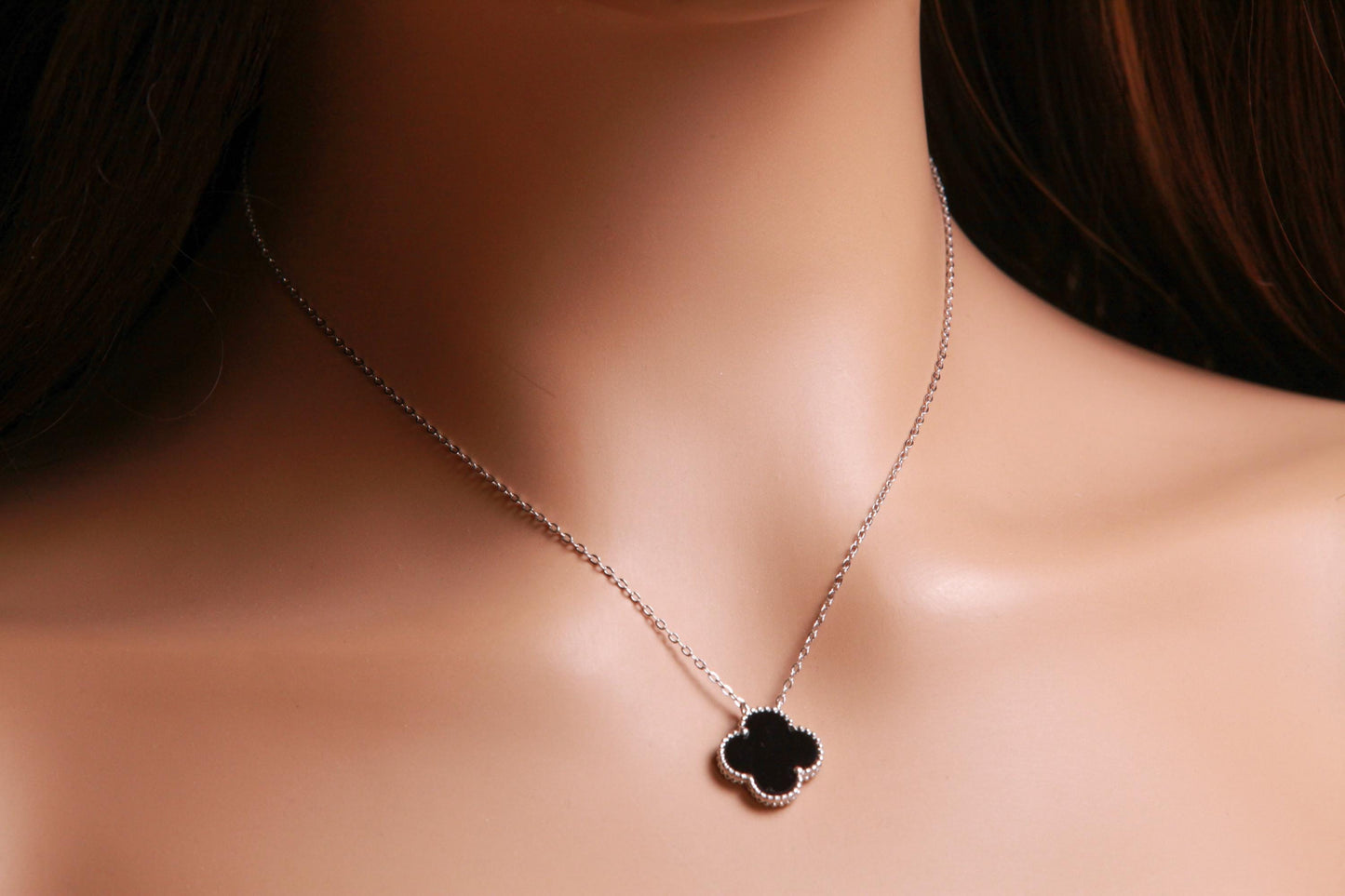 Sterling Silver Black Onyx Double Sided 16mm four leaf Flower Charm 16” extend to 17” and 18” Necklace, Love charm