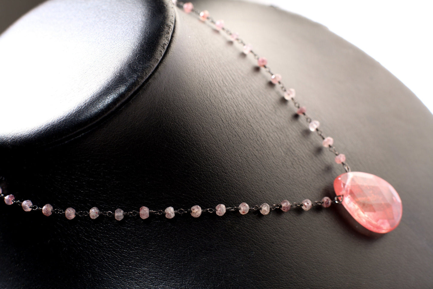 Strawberry Quartz Faceted Pear Drop Pendant in Strawberry Quartz Wire Wrapped Rosary Chain Necklace