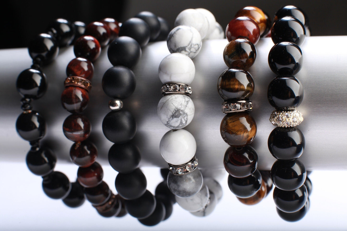 Black Onyx with Rhinestone Healing Bracelet, Gemstone Bracelet, Stone Bracelet, Crystal Bracelet, Natural Stone Minimalist Stretch Beaded Handmade Bracelet 12mm 8"