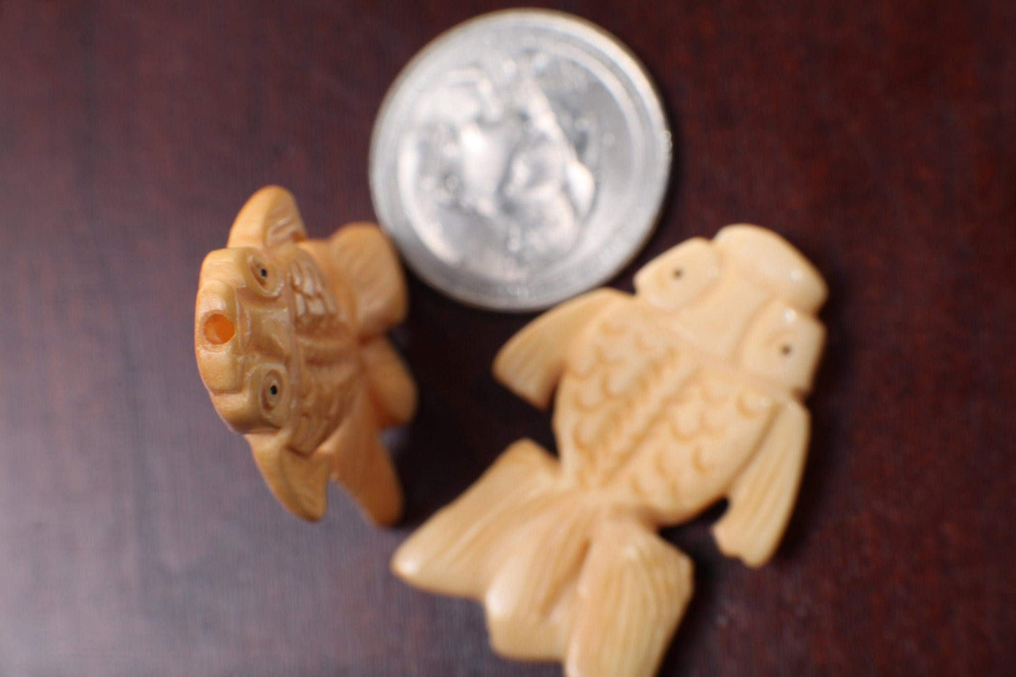 Carved Buffalo Bone Gold Fish, 25x38mm Hand Crafted Double Sided Animal Figurine Drilled Bead, Art Deco