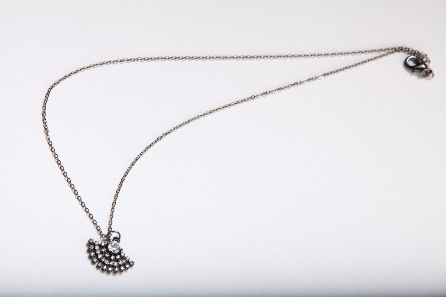 Cubic Zirconia Oxidized and Rhinestone Diamond Ball Micro Pave Fan Charm Necklace. Available in 16", 18" and 20"