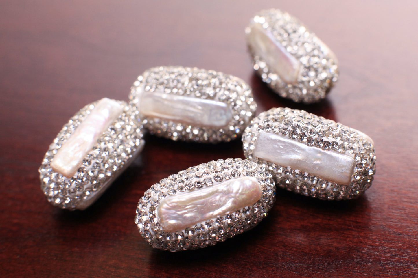 Freshwater Biwa Pearl 3 sided, Multiple Line Inlaid Silver, Clear Rhinestone Crystal Handmade Fancy Focal Bead, 30mm Long, 1 pc, Jewelry Making Bling Bead