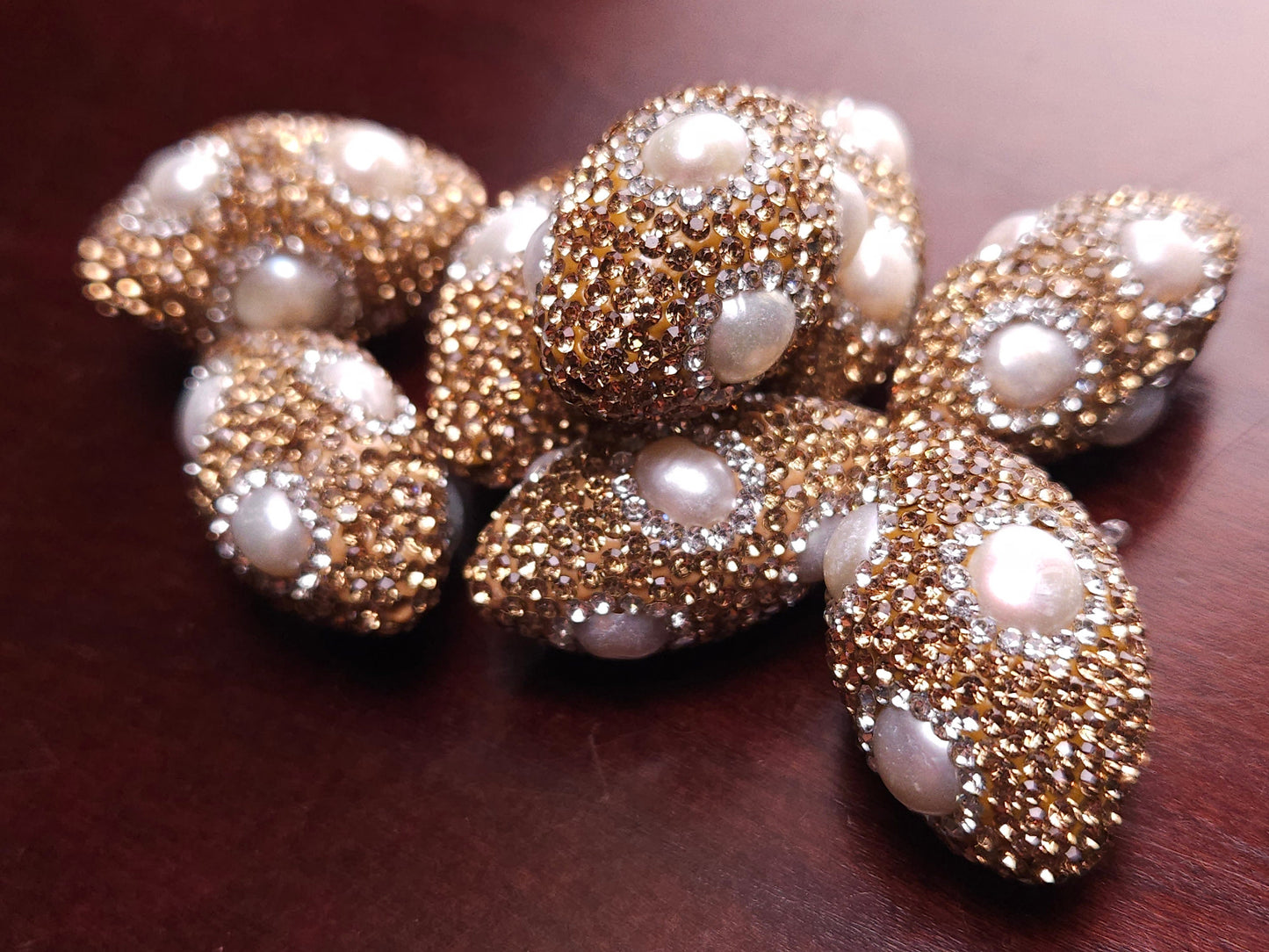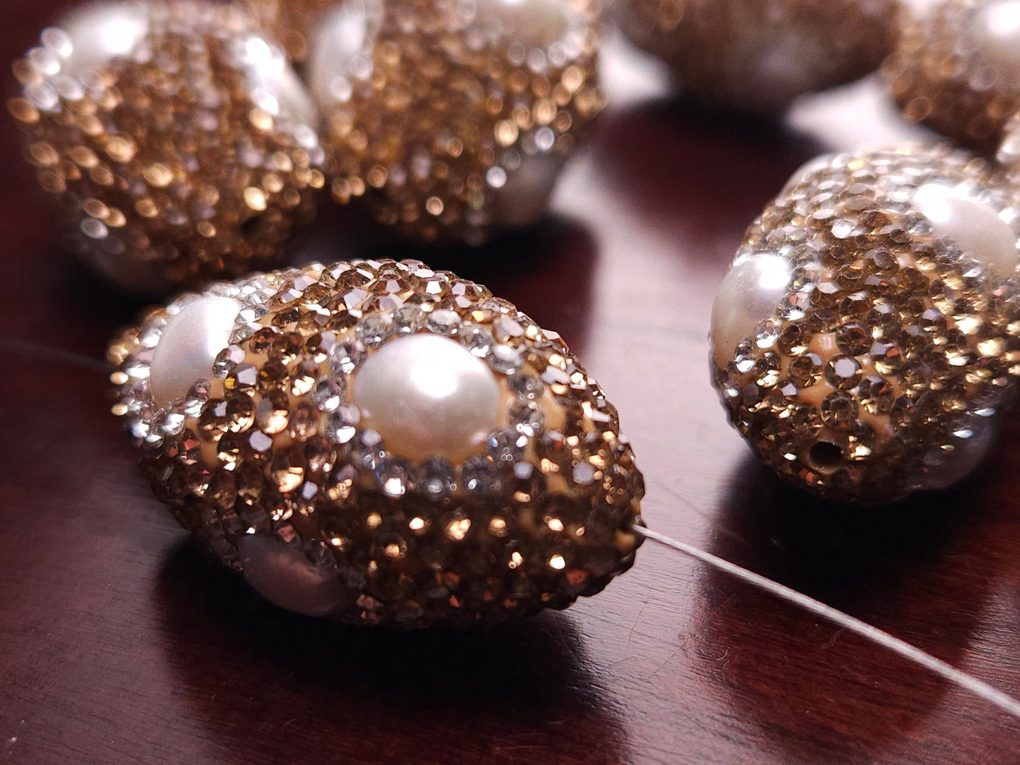 Freshwater Pearl with Gold Crystal Pave Rhinestone Handmade Fancy Focal Bead, 18x30mm, 1 pc, Jewelry Making Bling Bead