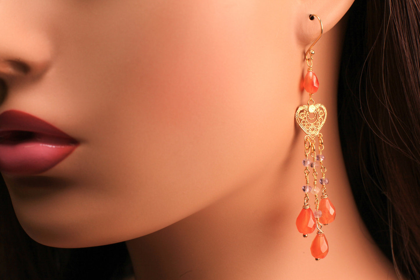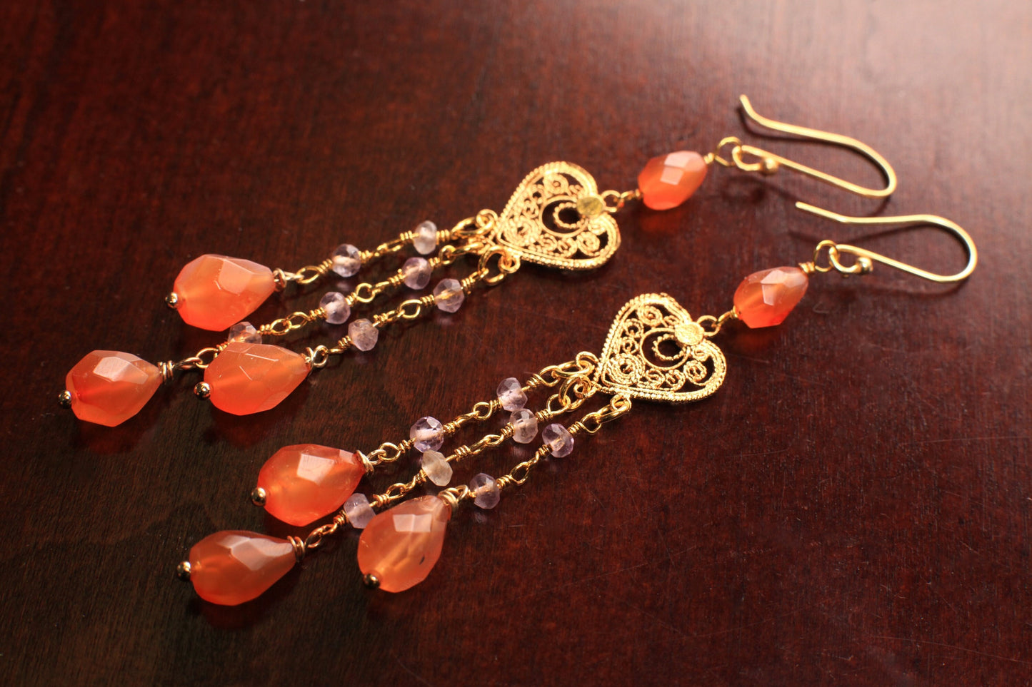 The briolette cut chandelier carnelian gold heart earrings arrived home quickly, in time for valentines day. They are very beautiful, well crafted, high quality gems, I love how the gems are cut, and their loveliness!