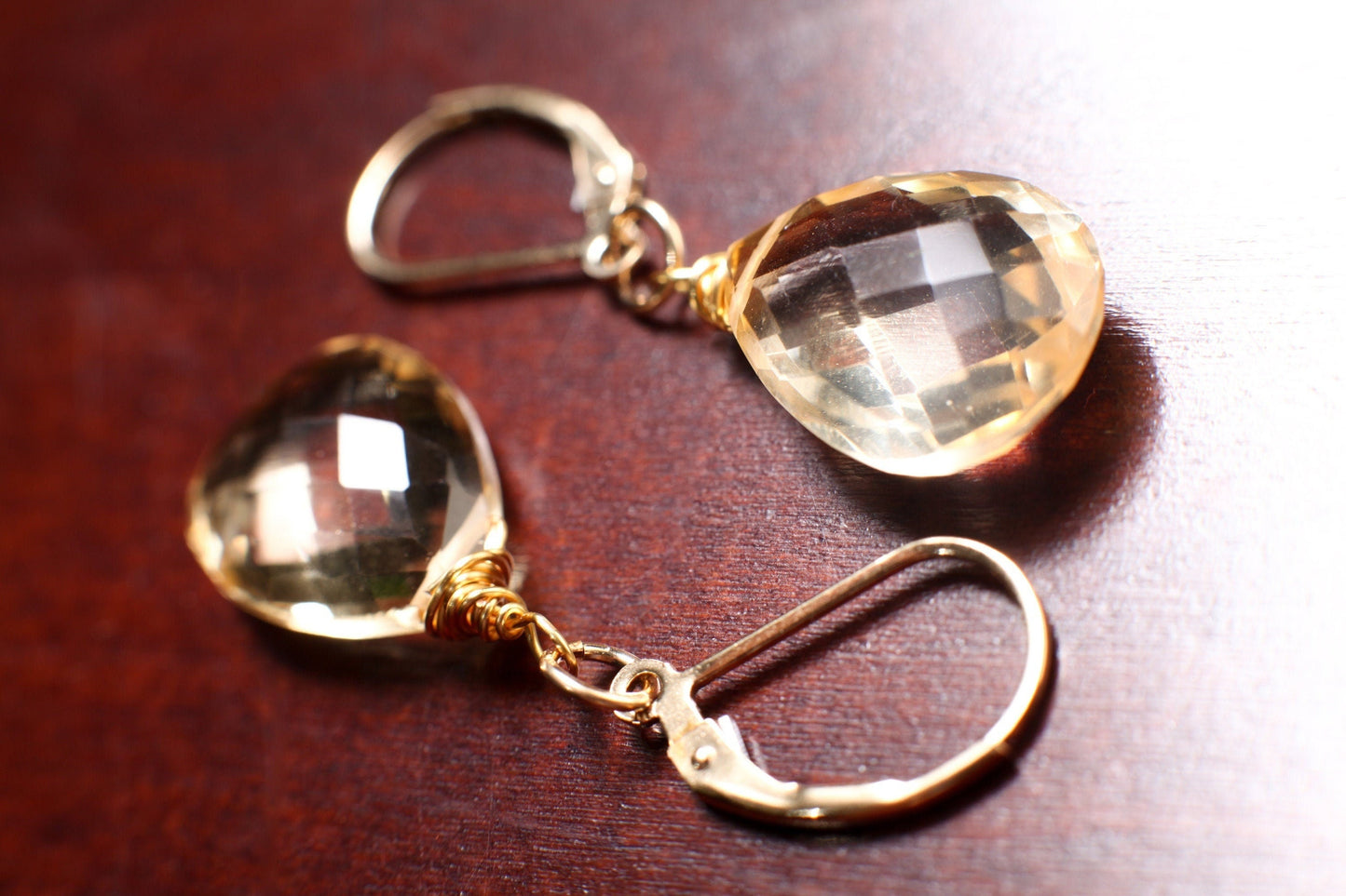 Genuine Citrine Faceted Teardrop Wire Wrapped Earrings, 12x16mm Citrine Pear Drop in 14K Gold Filled or 925 Sterling Silver Leverback