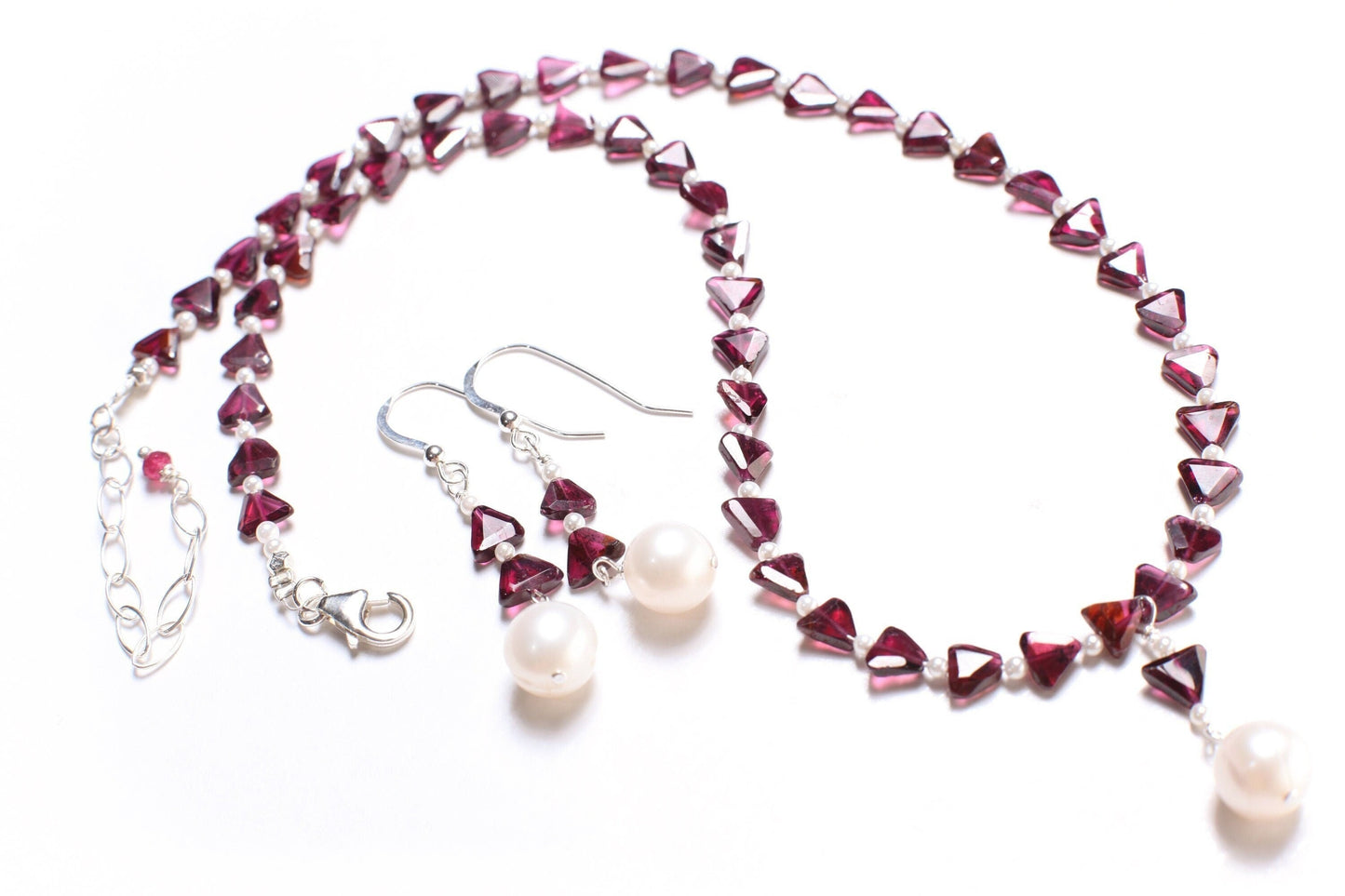 Genuine Garnet with 2.5mm Freshwater Pearl Spacers Necklace with 8mm Freshwater Pearl Centerpiece and Matching Dangling Sterling Silver Freshwater Pearl Earrings Jewelry Set