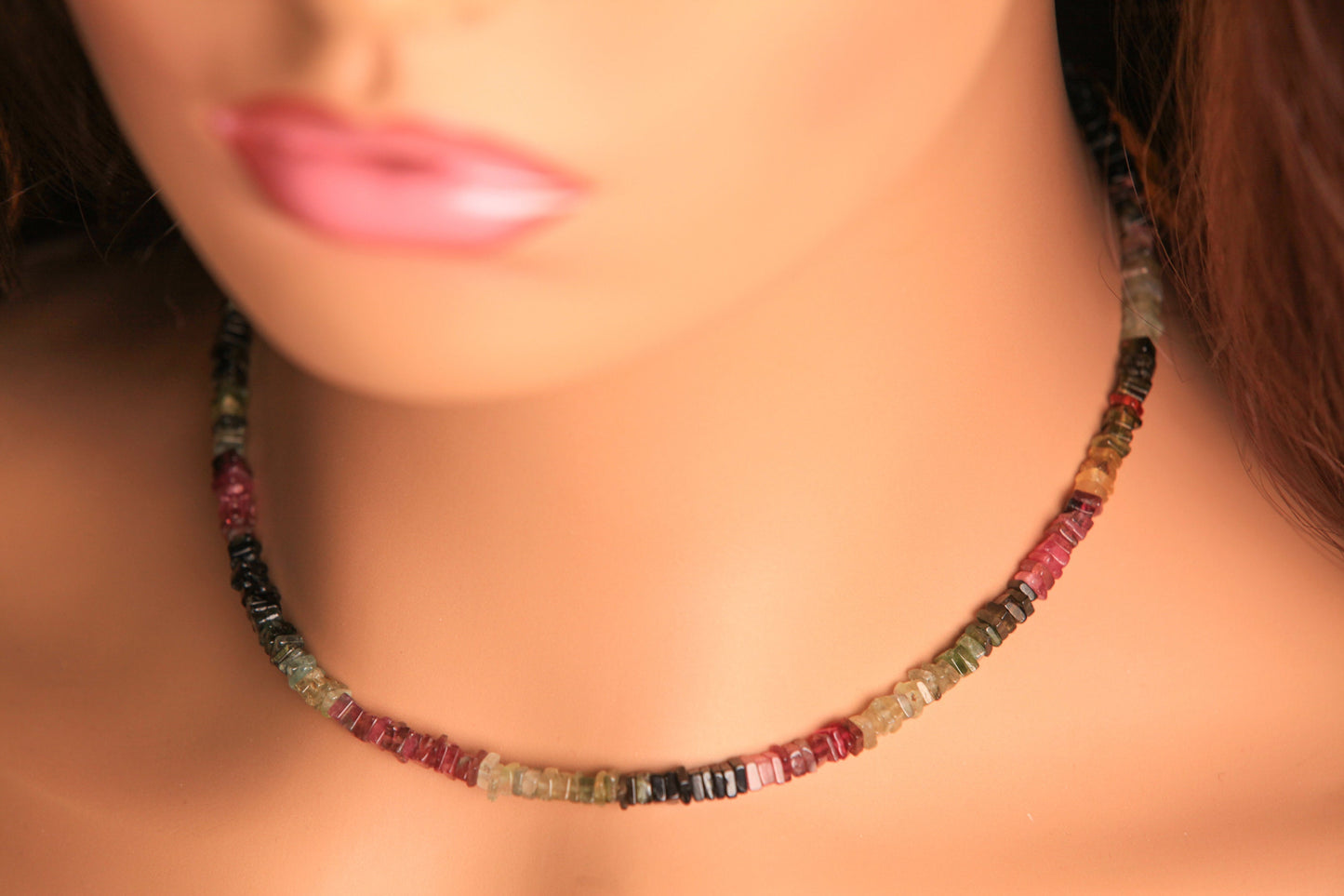 Genuine Multi Watermelon Tourmaline 4-4.5mm Heishi square silver Necklace for Man and Woman , Energy healing gems