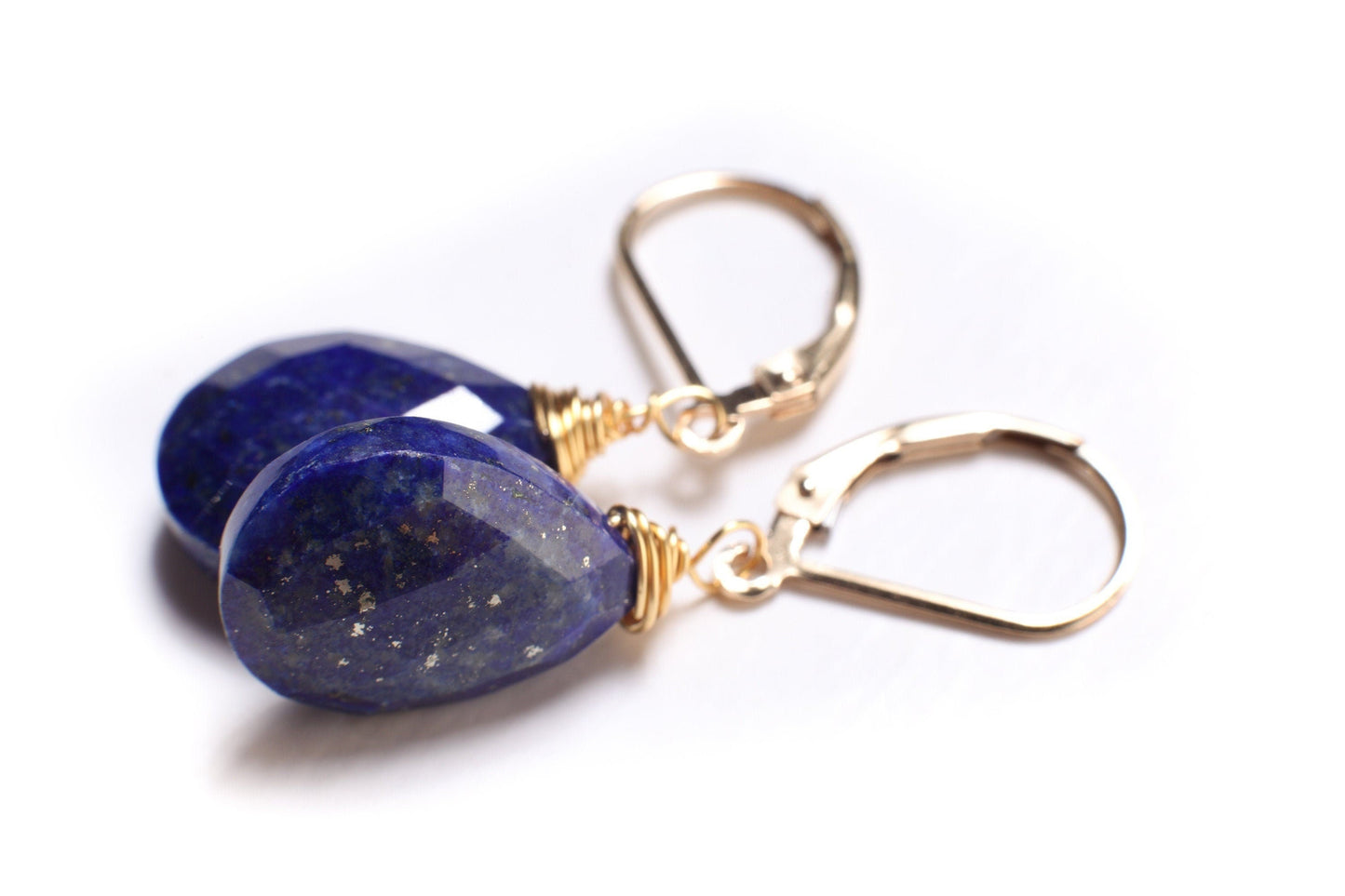 Lapis Lazuli Earrings, Natural Lapis Pear Drop 12x16mm Wire Wrapped Long Teardrop in 14K Gold Filled or 925 Sterling Silver Leverback