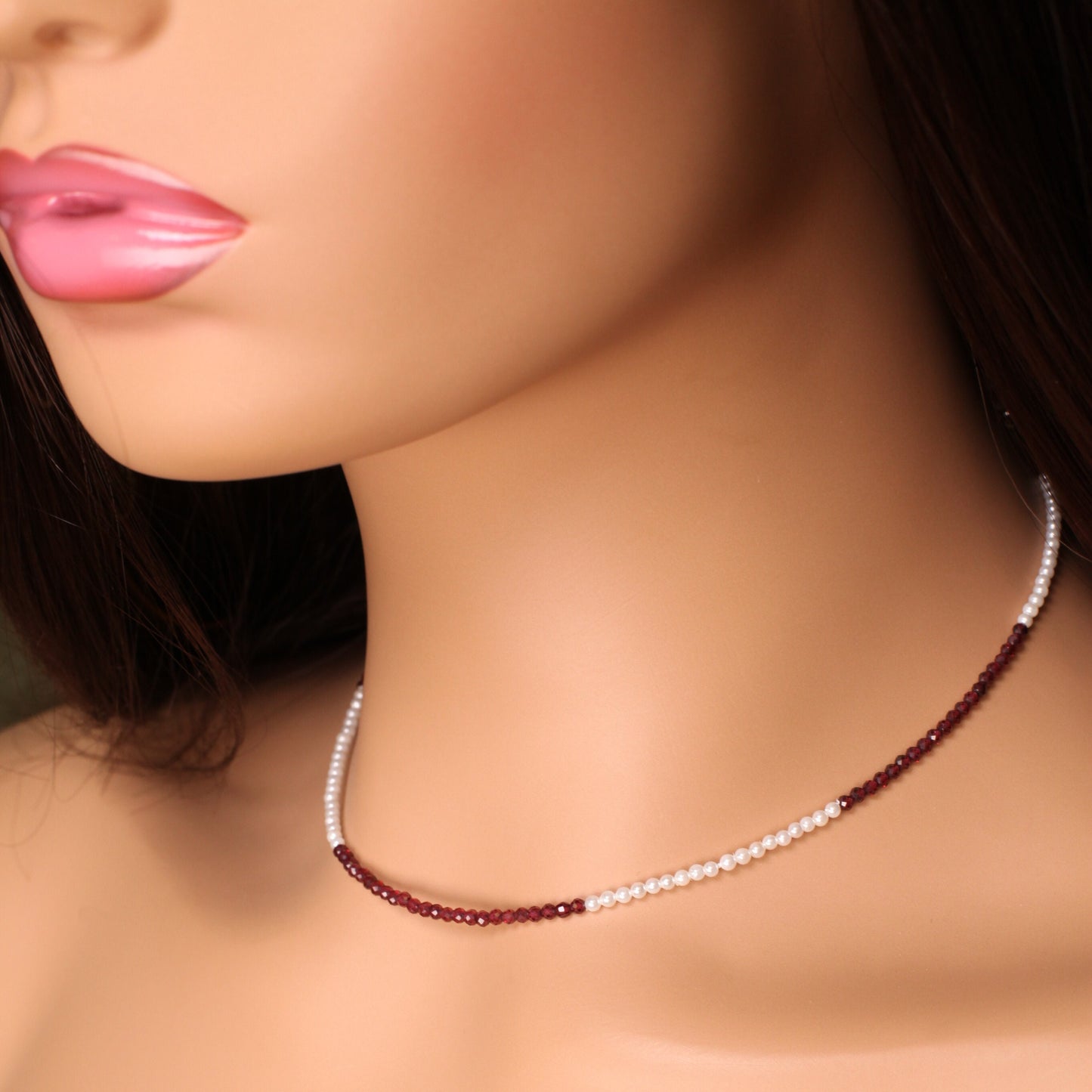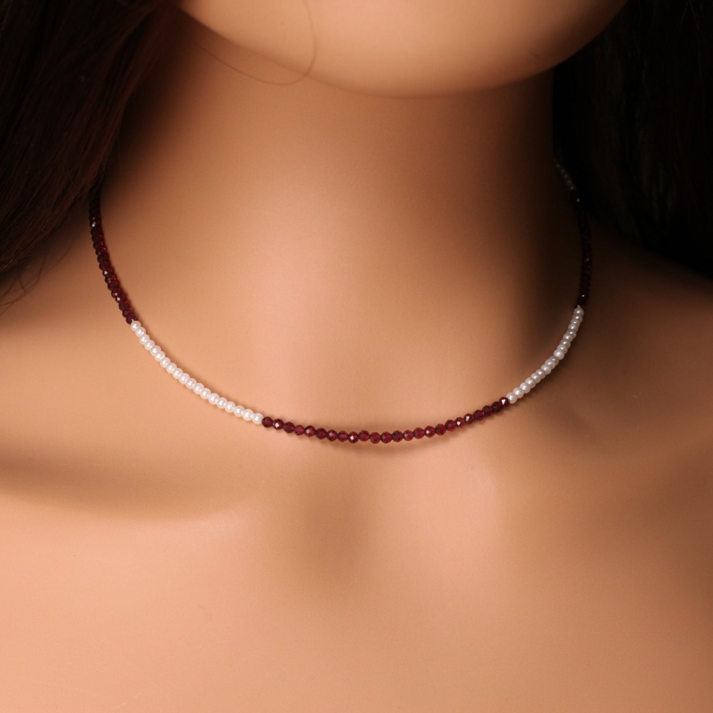 Merlot Red Garnet 2.5-3mm Faceted and freshwater pearl Choker Layering Necklace, 925 Sterling Silver, January Birthstone, Woman Gift
