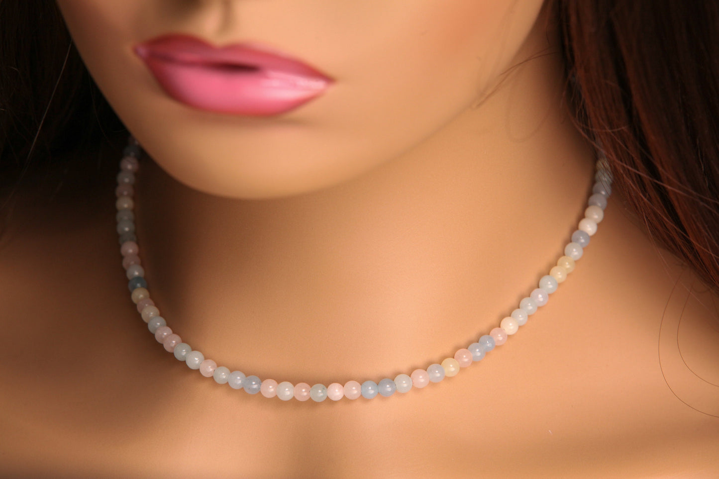 Morganite Round 4.5mm Baby Pink Blue Necklace for Man and Woman in Silver Lobster Clasp, Beach Boho Summer Gift