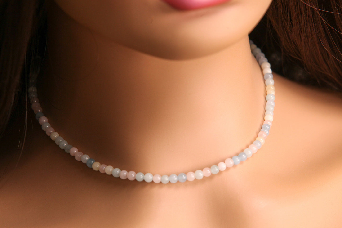 Morganite Round 4.5mm Baby Pink Blue Necklace for Man and Woman in Silver Lobster Clasp , Beach Boho Summer Gift