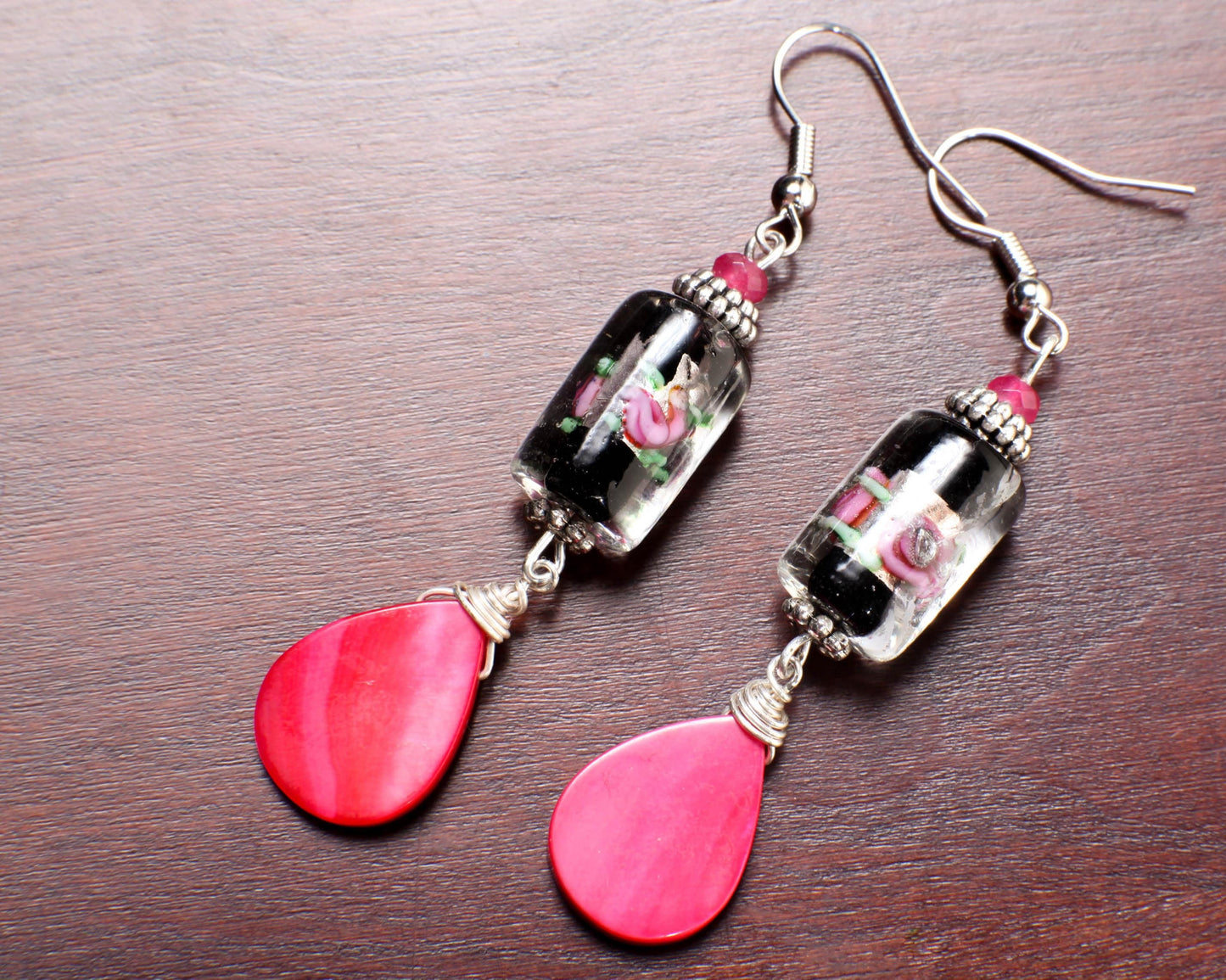 Mother of Pearl Pink Shell 14x20mm Drop Dangling Silver Foil Flower Lamp Work tube bead Handmade Earrings