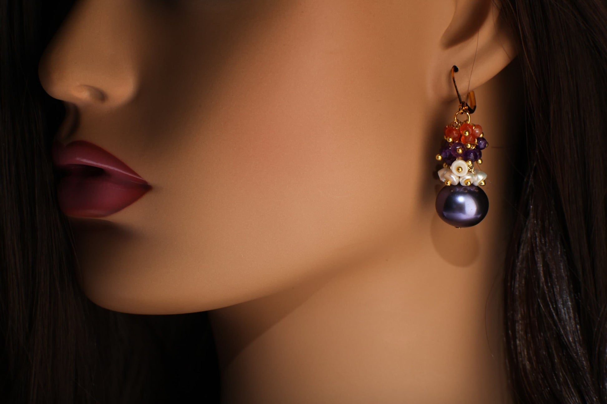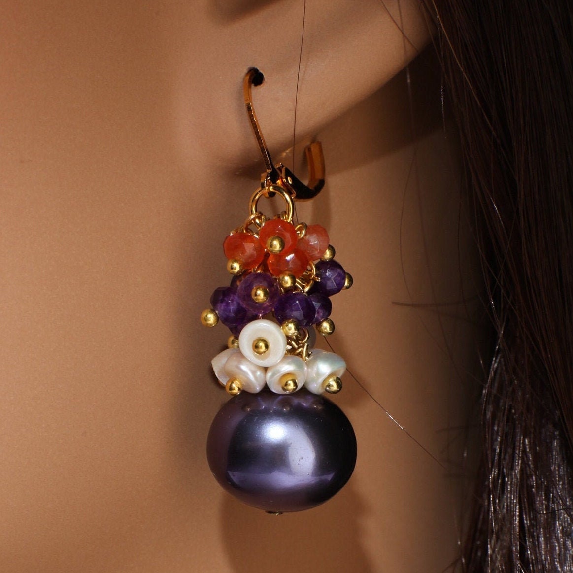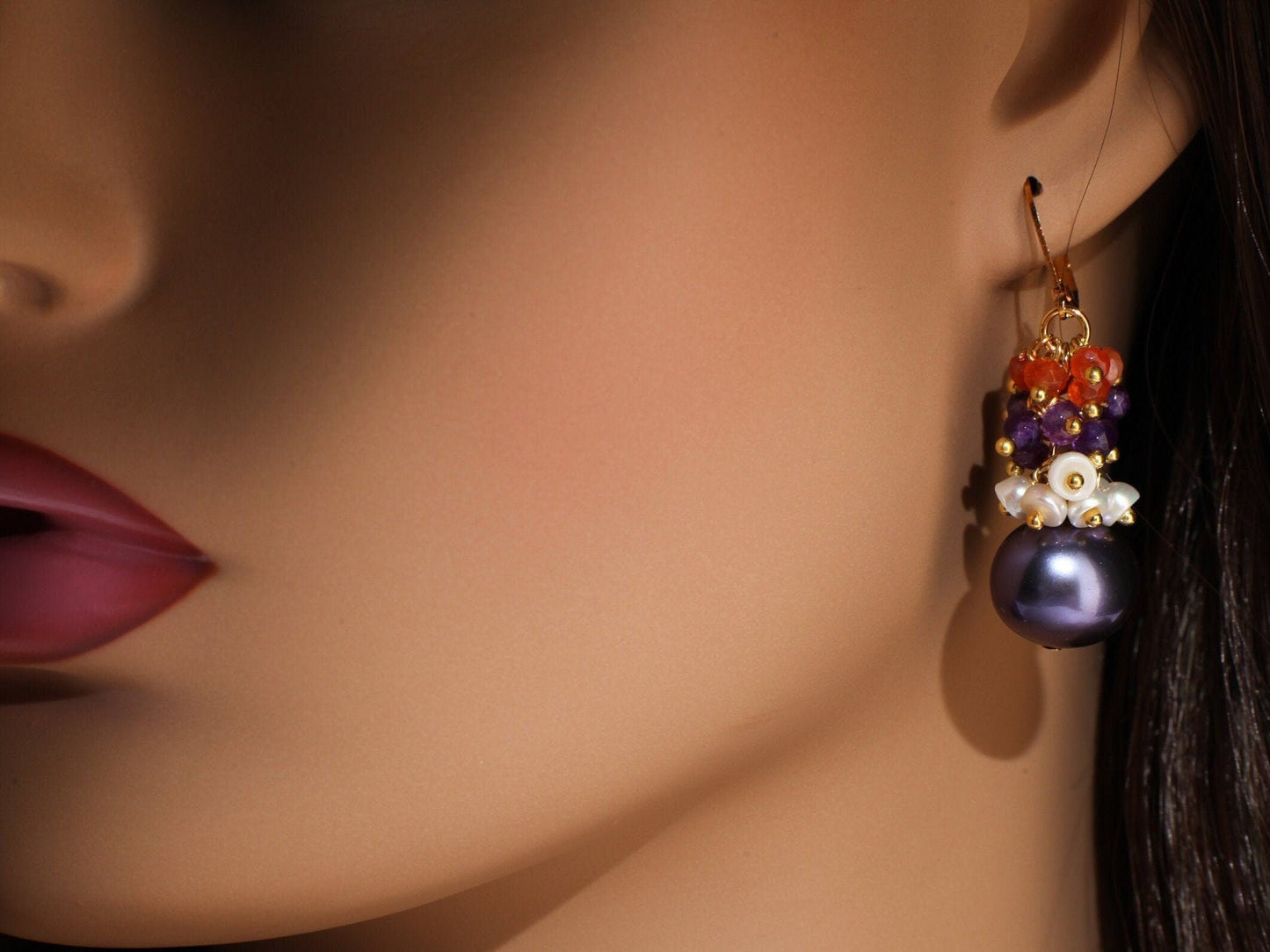 Multi Gemstones Clusters Earrings, Carnelian, Amethyst, Freshwater Pearl, Purple South Seashell Pearl Gemstone Leverback Earrings