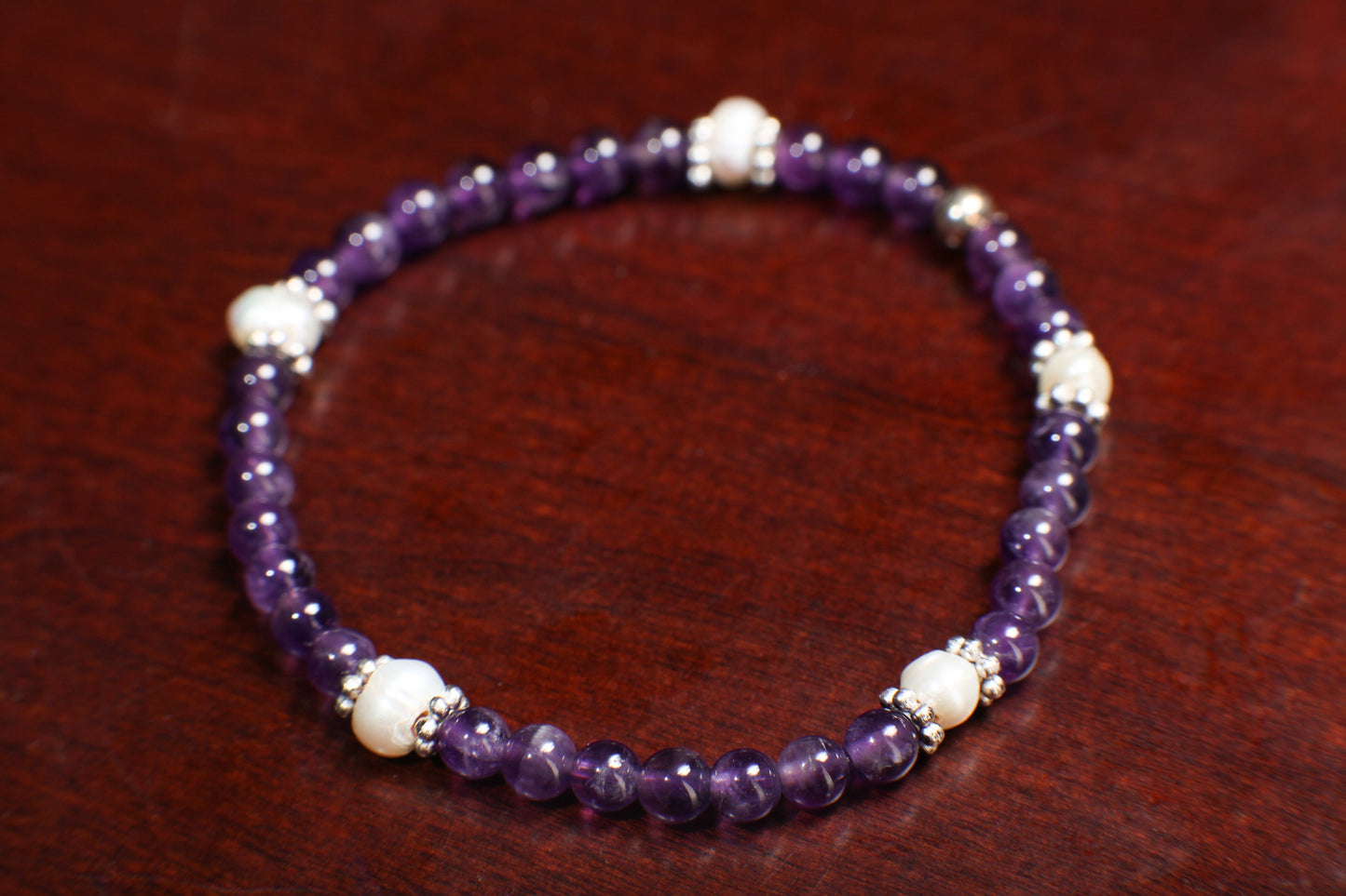 Natural Amethyst Round 4mm with Freshwater Pearl Rondelle Gemstone Bracelet, Healing Crystal, Yoga, Energy, Stretchy, Soothing Bracelet Gift