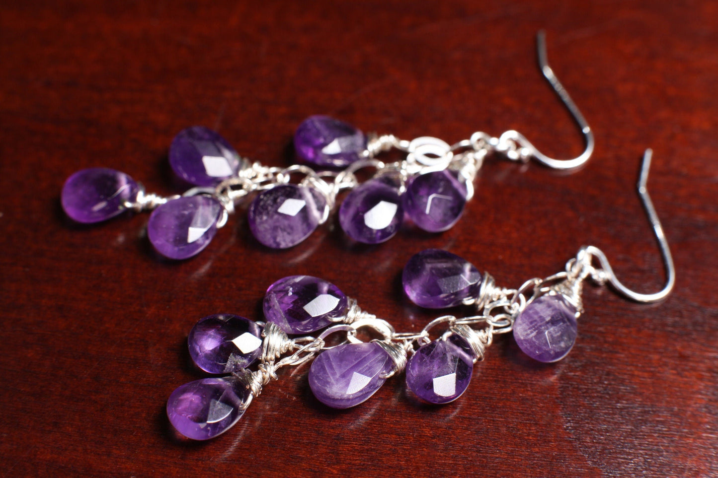 Natural Brazilian Amethyst Cascade Drop Earrings, 925 Sterling Silver,7x9mm Wire Wrapped Teardrop Dangling Earwire, Minimalist, Gift For her