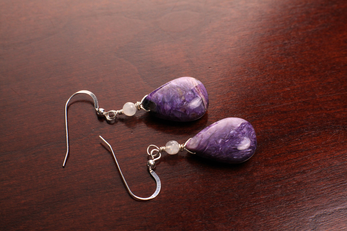 Natural Charolite smooth drop ,moonstone top spacer 925 sterling silver dangle earring. Beautiful rare AAA quality Gemstone earring