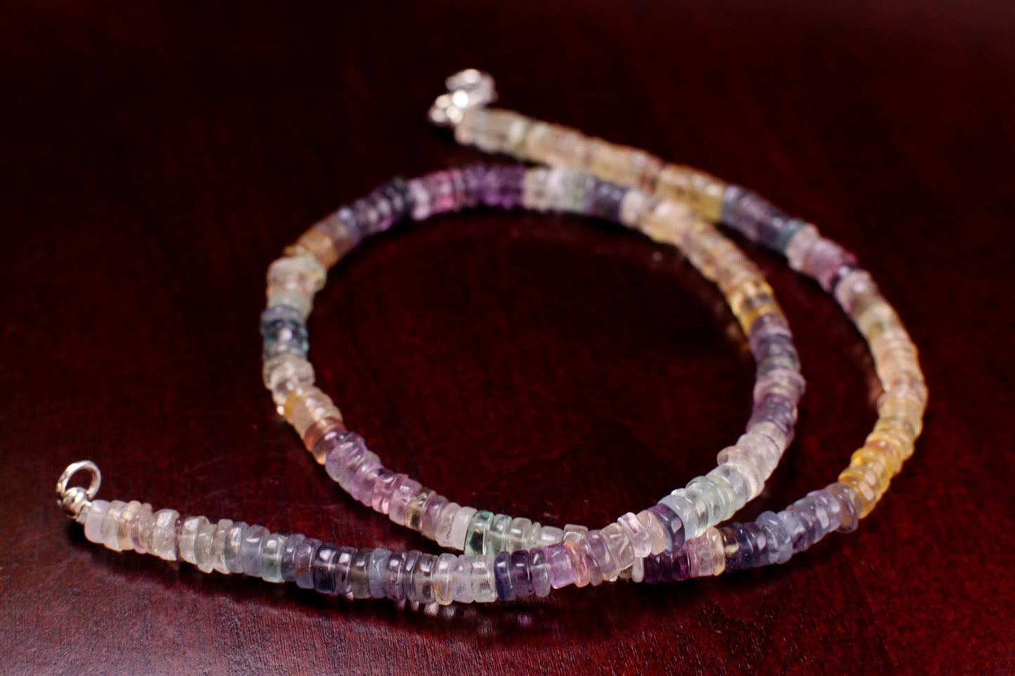 Natural Fluorite Heishi Roundel 4-5mm beautiful purple-yellow shaded Necklace for Man and Woman in Silver Lobster clasp, Beach Gift