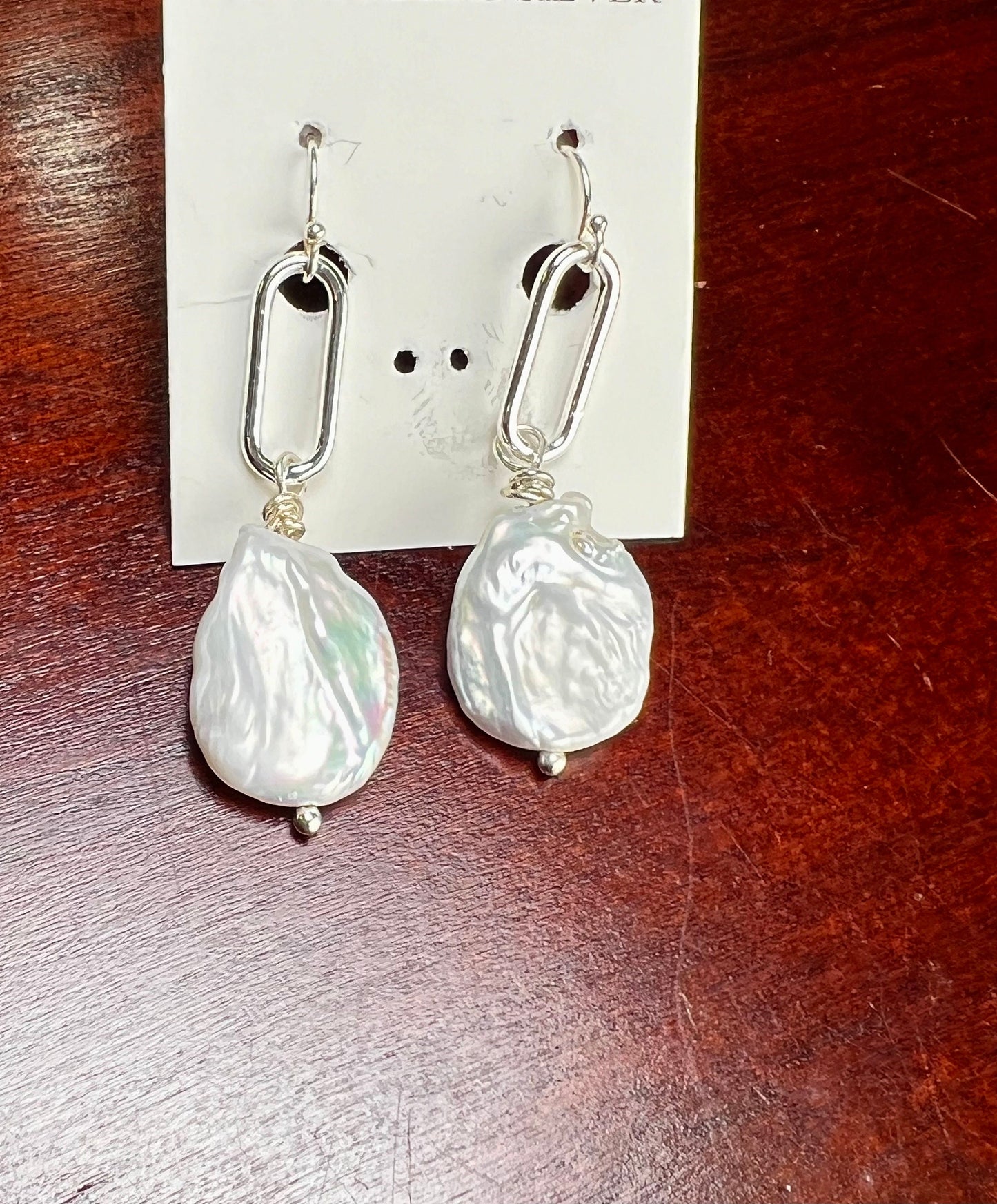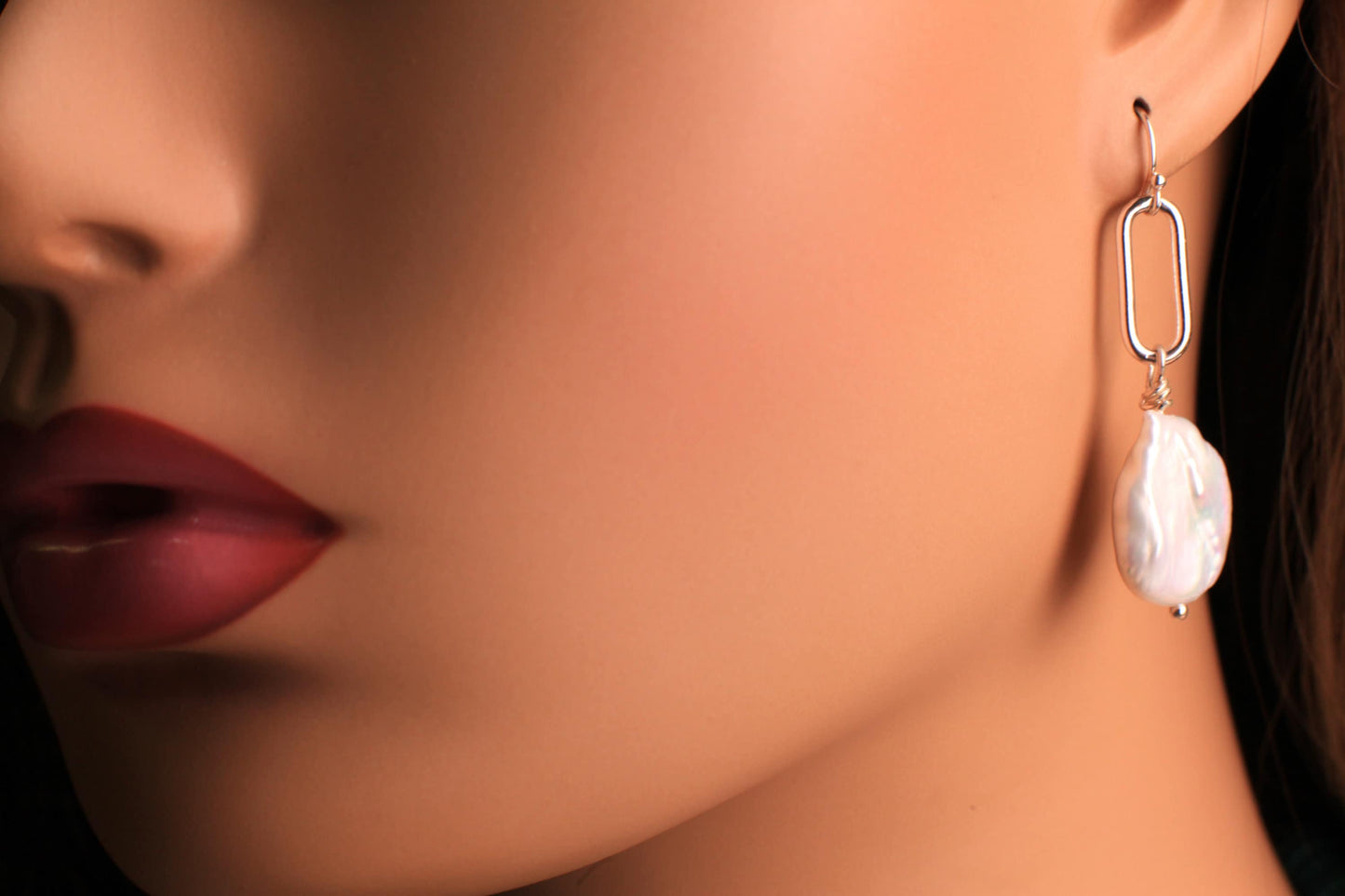 Natural Freshwater Coin Pearl 18mm large size Dangling Paper Clip Link 925 Sterling Silver Earrings