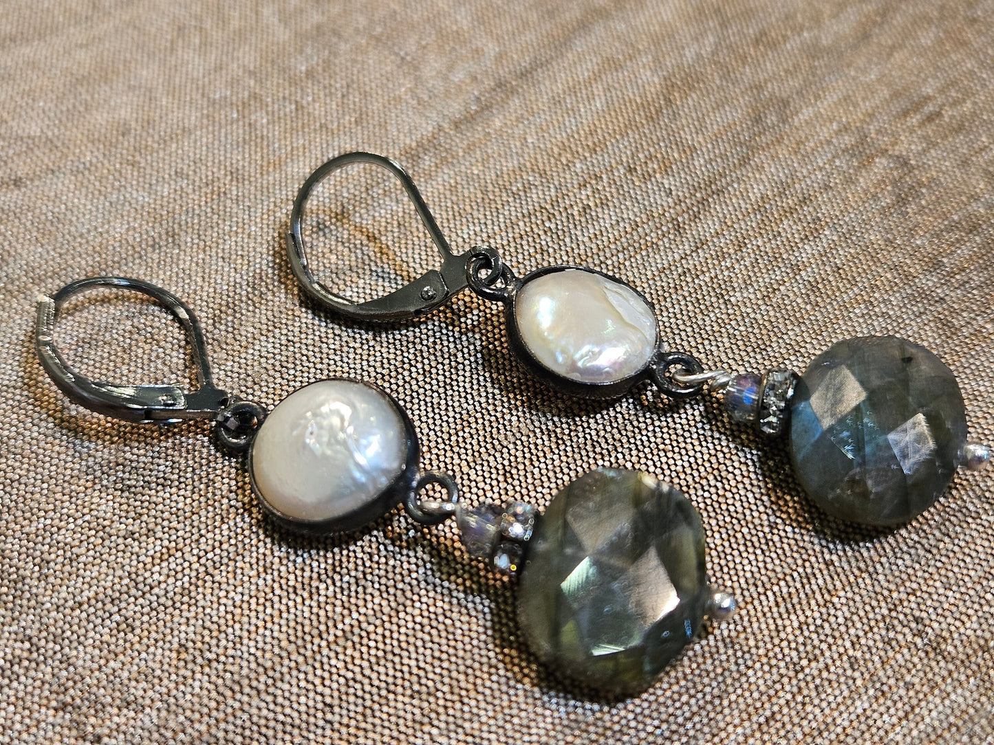 Natural Freshwater Coin pearl bezel Labradorite Free Form Oval with Dangling Oxidized Sterling Silver Leverback earring.