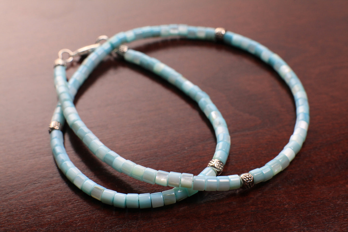 Natural Mother of Pearl baby blue Heishi 4mm washer bead Bali Style Silver Spacers rhodium silver lobster clasp Necklace for Men and woman