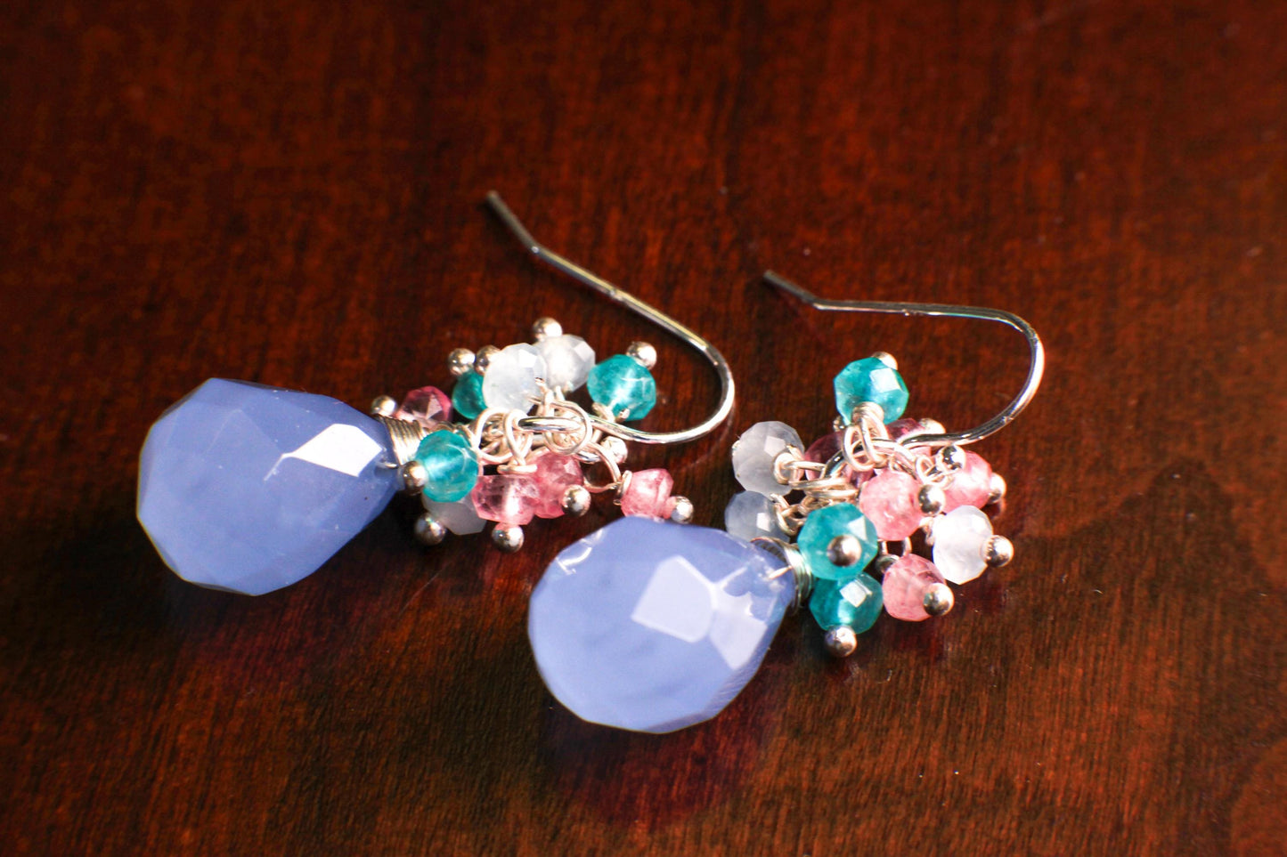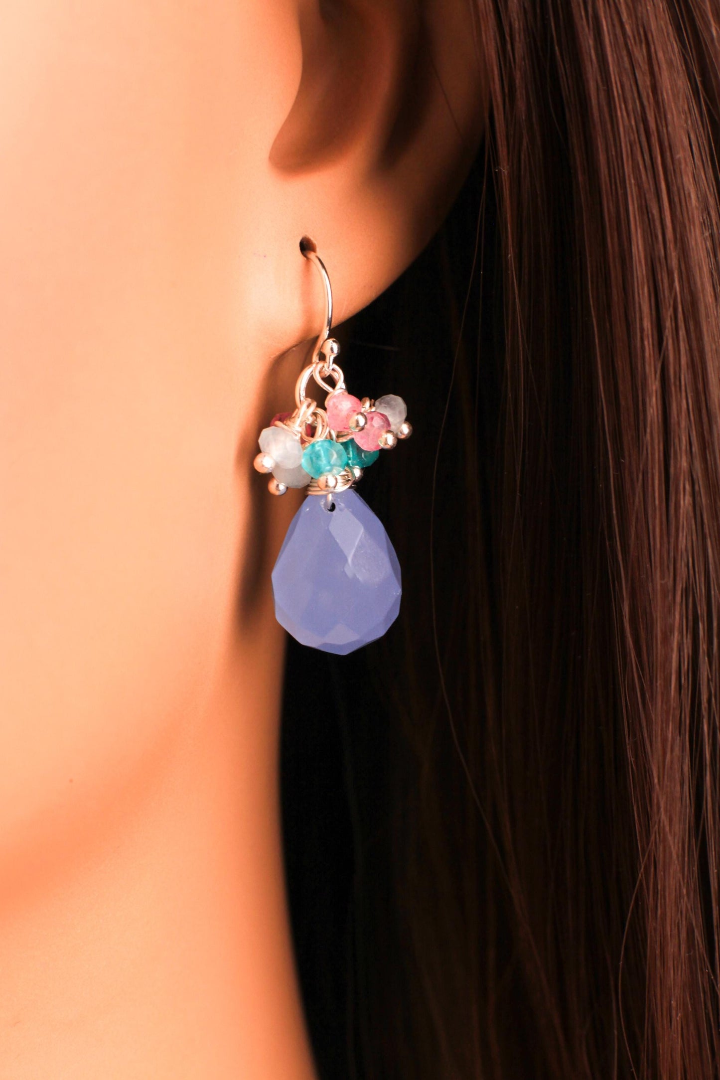 Natural Sky Blue Chalcedony 12x16mm Drop Briolette dangling, Apatite, Pink Topaz, Aquamarine Cluster 925 Sterling Silver Earrings