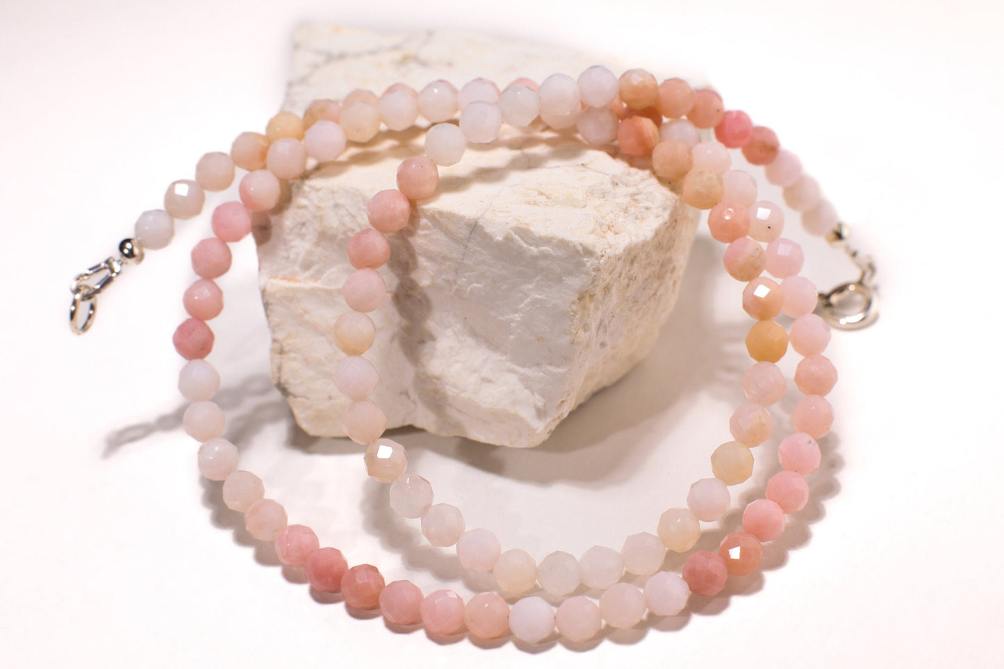 Pink Peruvian Opal Faceted 4.5mm Round Gemstone Choker, Layering Necklace in 925 Sterling Silver Chain and Clasp, Valentine Gift for her